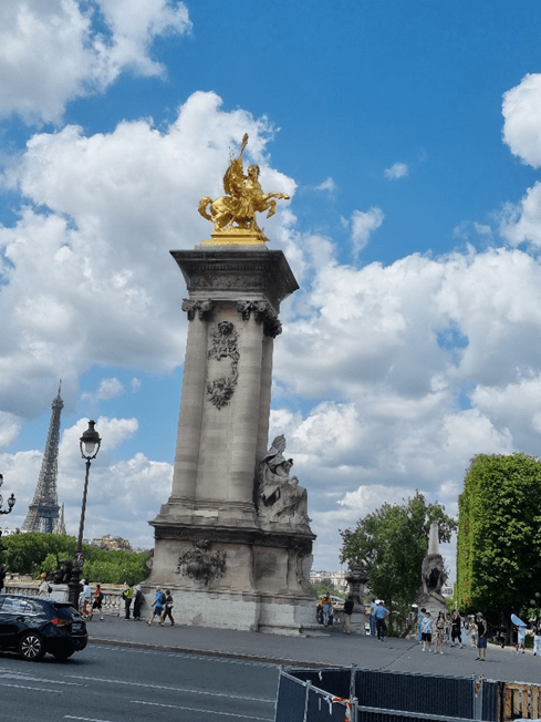 Vi fortsätter längs Seine mot bron Pont Alexandre III. Vi passerar gröna områden, där hemlösa bor i olika tält. Det är dessa tält, som Paris nu i 2024 ska ta bort inför OS.