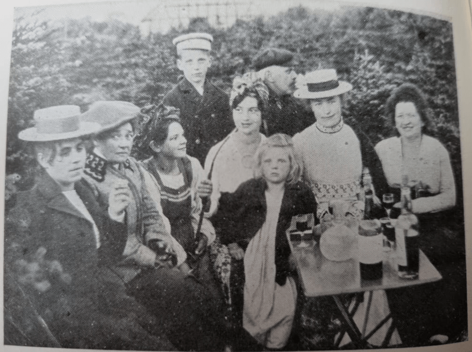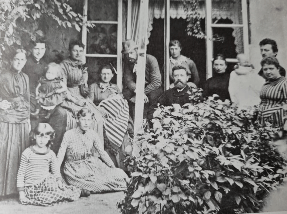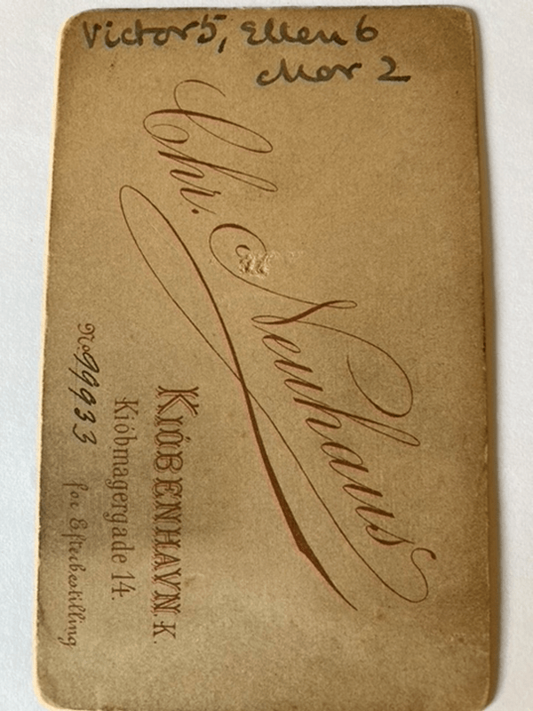 Min mormor omgiven av sina barn. Från vänstra: Cathrine (Tinne) (1911–2001), Marie Louise (Misse) (1916–2001), Carl (1909-1990), min mormor Ida Carstensen (född Callesen) (1879-1964), Johanne (Hanne) (1917-1991), min mor Helene (Lene) (1921-2021), Christine (Didi) (1914-1992). Namnen i parentes var det som gällde inom familjen – så det var dessa namn min mor använde när hon pratade om sina syskon. Det är svårt att veta när bilden är tagen, alla är finklädda och välkammade.